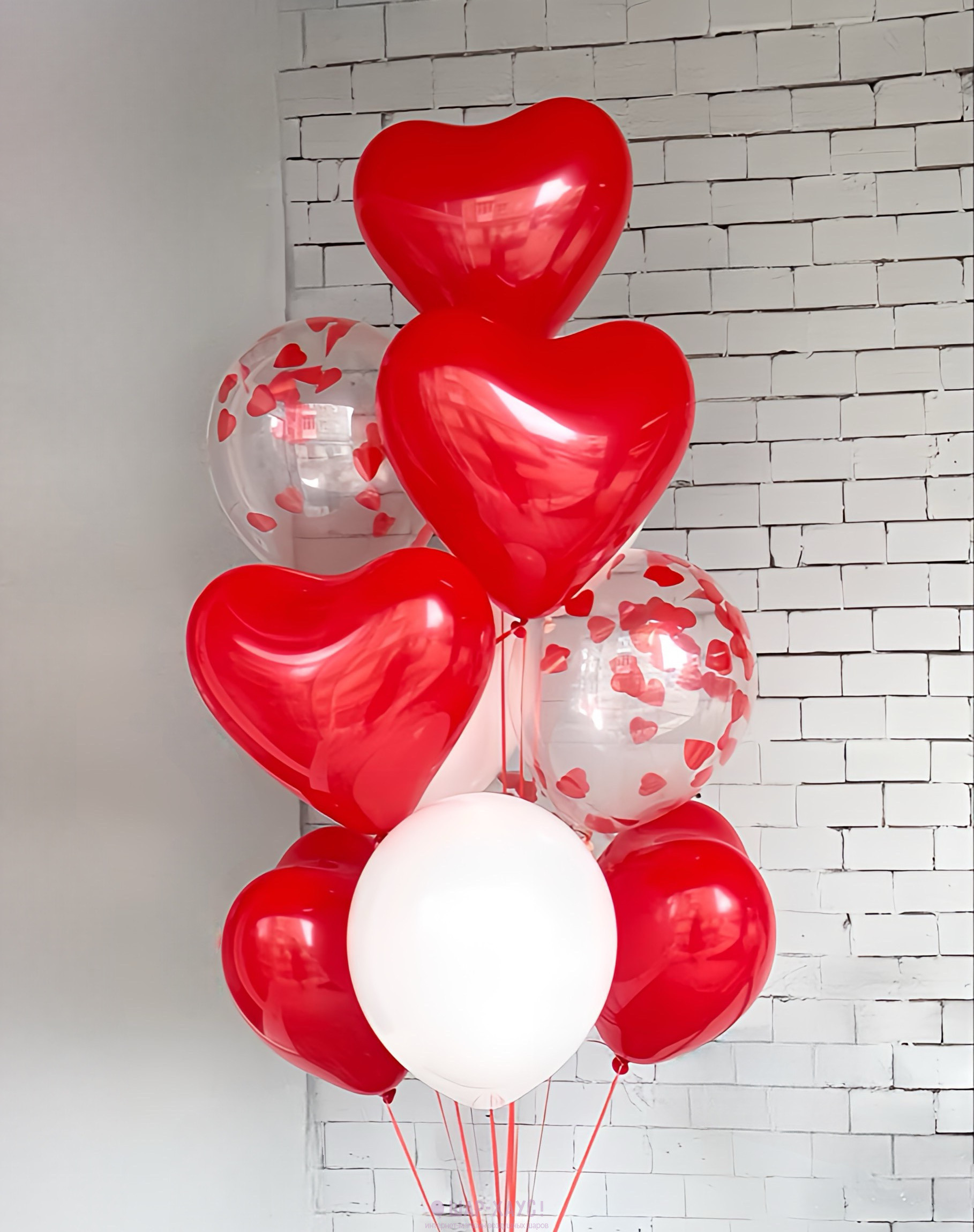 Фонтан из фольгированных сердец и латексных шаров с конфетти