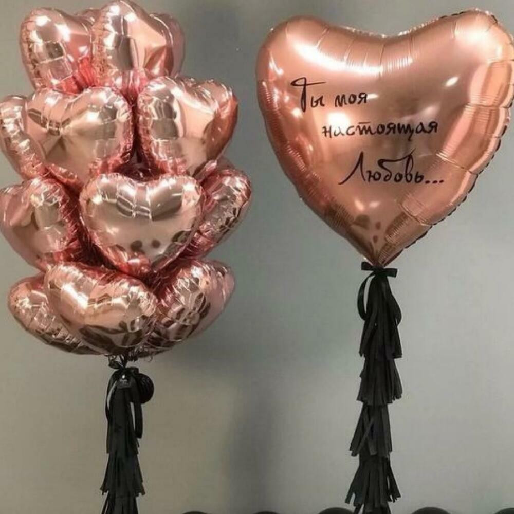 В композиции 2 фонтана по 5 шаров и сердце 86 см с индивидуальной надписью